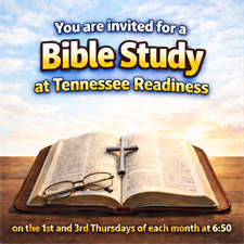 Tennessee Readiness will host a Bible study on the first and third Thursdays of each month at 6:40 PM. You are invited to join us as we meet for the first time on April 2nd. Feel free to bring a dish if you would like, and we can share food together as we have our first Bible study on April 2nd. Thank you for joining us.